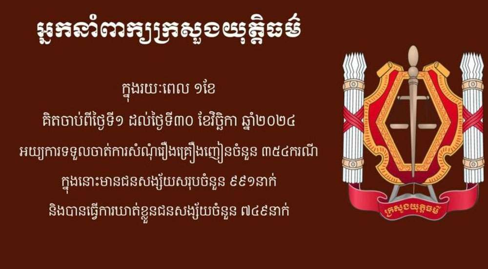 ភ្នំពេញ៖ អ្នកនាំពាក្យក្រសួងយុត្តិធម៌សូមជម្រាបជូនសាធារណជនទាំងអស់ជ្រាបថា ក្នុងរយៈពេល ១ខែ គិតចាប់ពីថ្ងៃទី១ ដល់ថ្ងៃទី៣០ ខែវិច្ឆិកា ឆ្នាំ២០២៤ សាលាដំបូង និងអយ្យការអមសាលាដំបូងរាជធានី-ខេត្ត បានទទួលចាត់ការលើសំណុំរឿងពាក់ព័ន្ធនឹងគ្រឿងញៀនសរុបចំនួន ៣៥៤ ករណី ដែលក្នុងនោះ មានជនសង្ស័យចំនួន ៩៩១ នាក់ និងត្រូវបានឃាត់ខ្លួនចំនួន ៧៤៩ នាក់។