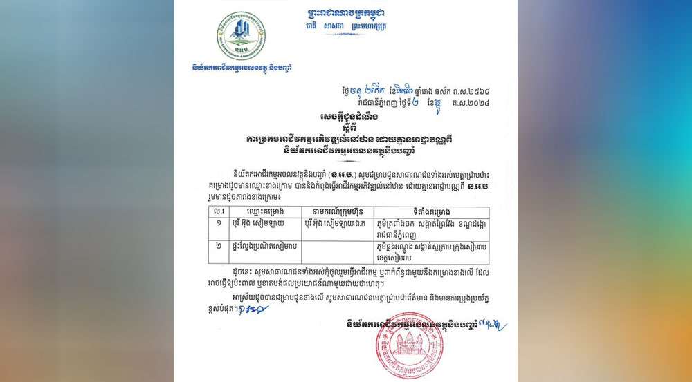 សង្គម និយ័តករអាជីវកម្មអចលនវត្ថុ និងបញ្ចាំ ចេញសេចក្តីជូនដំណឹង ស្តីពី ការប្រកបអាជីវកម្មអភិវឌ្ឍលំនៅឋាន ដោយគ្មានអាជ្ញាបណ្ណពីនិយ័តករអាជីវកម្មអចលនវត្ថុនិងបញ្ចាំ By obnasia - December 5, 2024 0