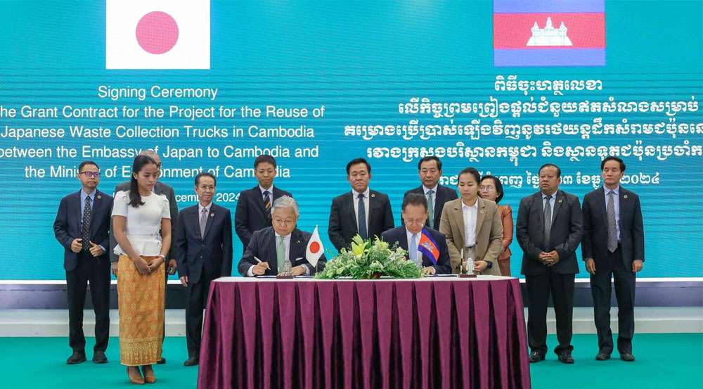 ឯកឧត្តមបណ្ឌិត អ៊ាង សុផល្លែត រដ្ឋមន្រ្តីក្រសួងបរិស្ថានកម្ពុជា និងឯកឧត្តម អ៊ូអិណុ អាត់ស៊ូស៊ី ឯកអគ្គរាជទូតវិសាមញ្ញ និងពេញសមត្ថភាពរបស់ប្រទេសជប៉ុនប្រចាំកម្ពុជា នៅថ្ងៃចន្ទទី២៣ ខែធ្នូ ឆ្នាំ២០២៤ បានអញ្ជើញចូលរួមជាអធិបតីនៅក្នុងកម្មពិធីចុះហត្ថលេខាលើ «កិច្ចព្រមព្រៀងផ្តល់ជំនួយឥតសំណងរវាងក្រសួងបរិស្ថាន និងស្ថានទូតជប៉ុនប្រចាំព្រះរាជាណាចក្រកម្ពុជា» សម្រាប់គម្រោងប្រើប្រាស់ ឡើងវិញនូវរថយន្តដឹកសំរាមជប៉ុននៅ ក្រុង ស្រុកចំនួន ១០ ក្នុងខេត្តចំនួន ៧នៅក្នុងប្រទេសកម្ពុជា។