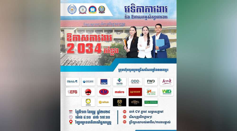 ទីភ្នាក់ងារជាតិមុខរបេរ និងការងារ និងវិទ្យាស្ថានជាតិពាណិជ្ជសាស្ត្រ សហការគ្នារៀបចំវេទិកាការងារ ដោយនាំយកឱកាសការងារថ្មីបន្ថែមទៀតចំនួន ២០៣៤ កន្លែង ពីក្រុមហ៊ុនធំៗ ១៩ សម្រាប់ផ្តល់ជូនយុវជន សិស្ស/និស្សិត និងអ្នកស្វែងរកការងារ នាថ្ងៃទី១៣ ខែកុម្ភៈ ឆ្នាំ២០២៥ ខាងមុខនេះ ចាប់ពីម៉ោង ៨ព្រឹក ដល់ ៥ ល្ងាច នៅក្នុងបរិវេណវិទ្យាស្ថានជាតិពាណិជ្ជសាស្ត្រ។